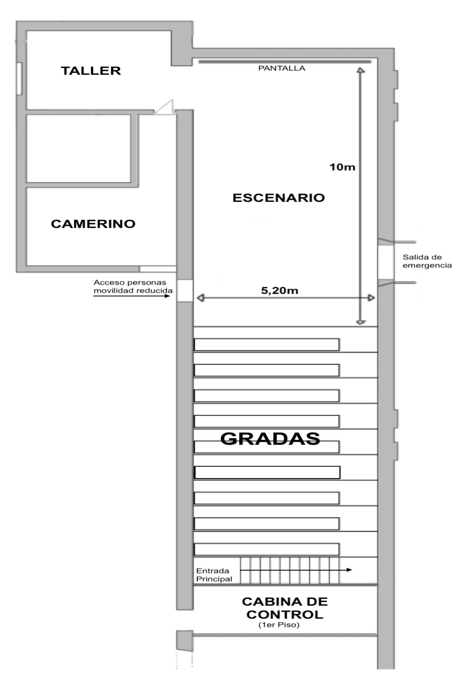 - Cabina de control: Ubicada en 1r piso, no conectada con escenario