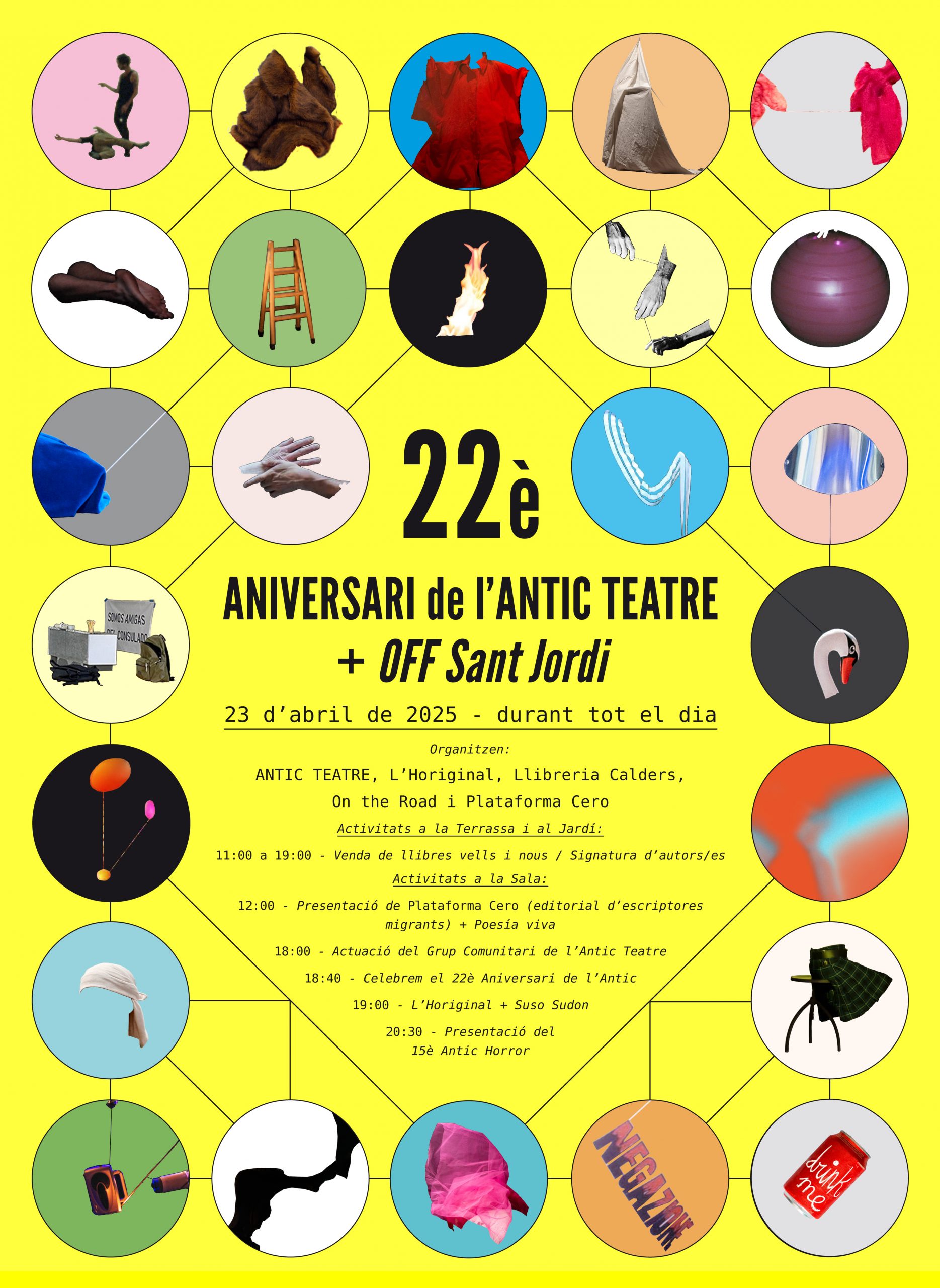 L’Antic Teatre fa 22 anys i ho celebrem, com sempre, acompanyades per la Llibreria Calders, la llibreria On The Road i l’Horiginal. Aquest any comptarem també amb l’editorial d’escriptores migrants, Plataforma Cero.