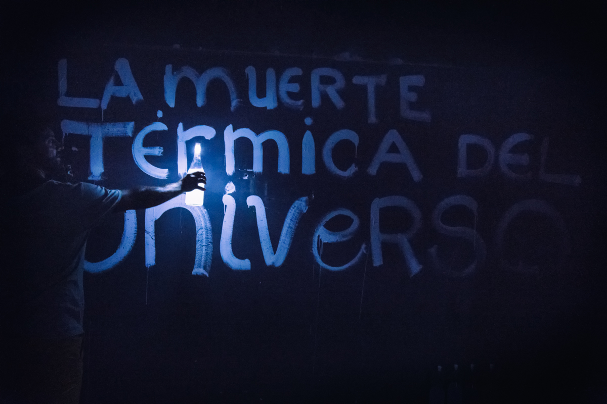 En el universo, como sistema aislado que es, la entropía crece constantemente. En un momento dado, la entropía llega a su máximo, produciendo un equilibrio entre todas las temperaturas y presiones que desemboca en la muerte térmica del universo. Final como nuevo principio. Porque descendemos de los monos y las bacterias, pero también de los astros y las galaxias. Estamos formados de polvo del Big Bang. Como se pregunta Hubert Reeves, ¿tenemos nosotros la memoria del universo? Activar conceptos científicos en un espacio (teatral) creando nuevas realidades (ficcionadas) reformulando y cuestionando los códigos escénicos e instalativos
