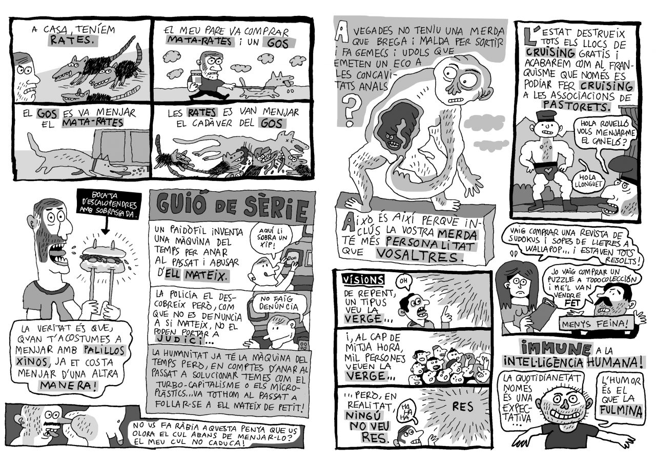 Roger Pelàez has been waiting many years for the moment when the idiots will take over the world, because he’s a major idiot and he’s convinced that, with a little luck, some piece or other of the world will fall to him. He sings, he draws, he studies the Talmud and he’s published comic books where he simplifies things to make life more manageable and digestible for people like him. Who have nothing, who are nothing and who aspire to nothing.